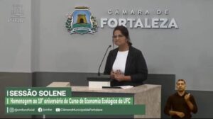 A sessão foi proposta pelo Vereador Gabriel Biologia, que iniciou sua fala destacando como suas vivências acadêmicas enquanto estudante de Biologia na UFC se entrelaçaram com a trajetória da Economia Ecológica. Ele relembrou a presença constante do curso nas discussões ambientais da universidade e ressaltou o papel que a EcoEco desempenha na formação de profissionais capazes de compreender e intervir nos desafios socioambientais contemporâneos.